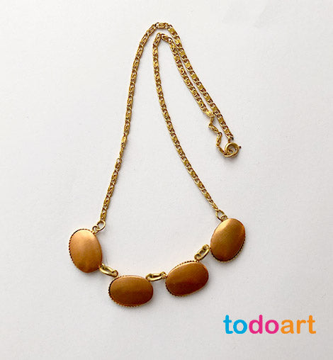 Copper fittings necklace Golden base of 8.5cm without counting the clasp and its chain, each circle measures 1cm, the copper sheets are embedded in the golden base.