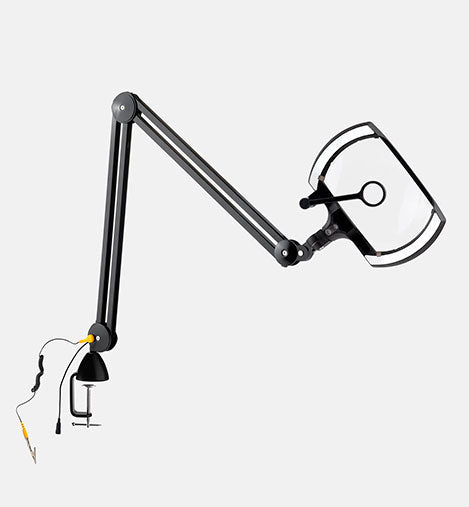 The articulated arm allows it to be placed in the desired position, it measures 122 cm and a very simple mechanism system with one hand, which in some laboratories is essential to be able to continue with the other hand occupied.
