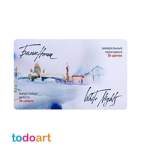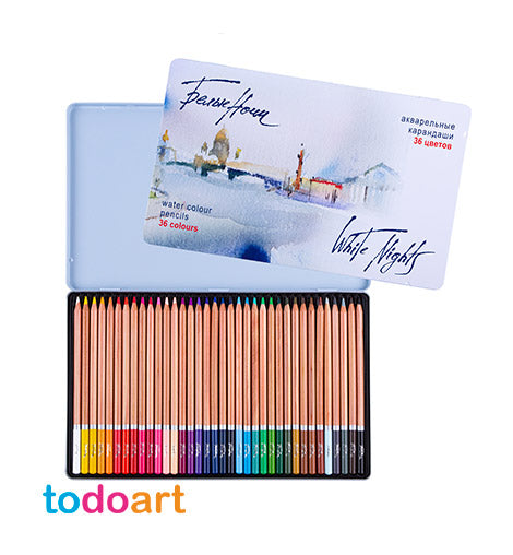 Box of 36 watercolor pencils. Vibrant and soft watercolor pencils. Perfectly combining the properties of watercolor paint and colored pencils, these high quality White Nights Watercolor Pencils are developed with professional artists, designers and illustrators in mind. They can be used with a variety of techniques, including wet wetting, drawing on wet paper, or color washes with a wet brush.