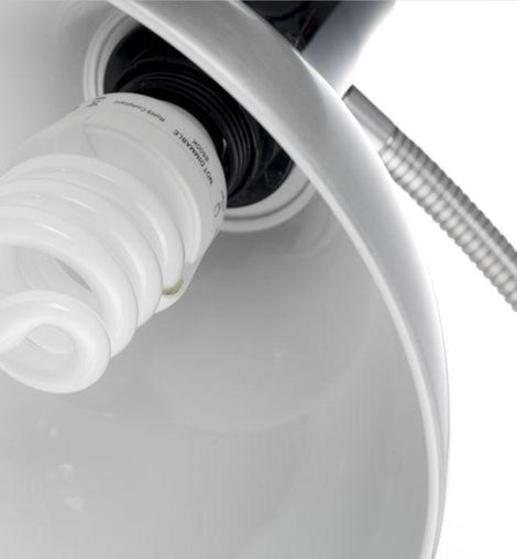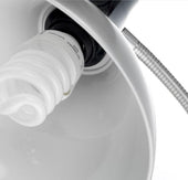 El foco esta construido de una campana de aluminio ligero y en su interior se encuentra la bombilla de 32 W, que emite un color de temperatura de 6500ºK.