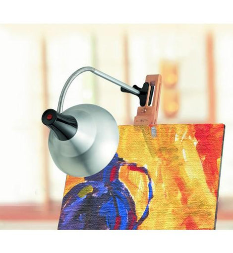 Diseñada para artistas que precisan luz diurna daylight™ perfecta mientras trabajan en cuadros de tamaño pequeño a mediano. Nuestro exclusivo y nuevo sistema “Clamp-lock™” mantiene la lámpara firmemente acoplada a cualquier caballete de hasta 3,2 cm / 1¼“ de grosor, incluso cuando el usuario ajusta el brazo flexible de 18 cm para dirigir la luz al punto deseado.