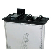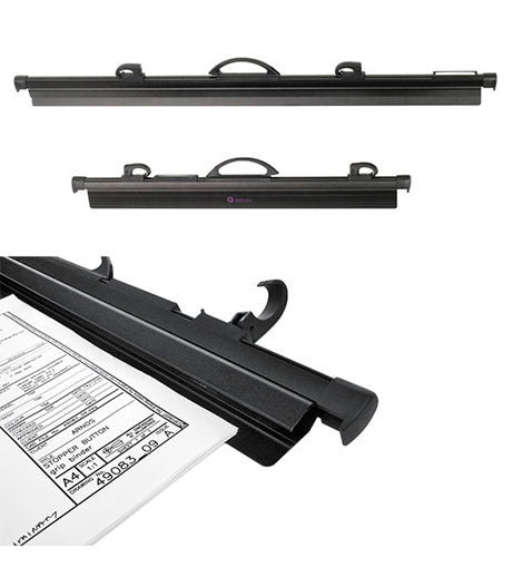 Cada percha construida de aluminio negro posee un sistema de cierre donde podemos poner hasta 90 hojas por cada percha.