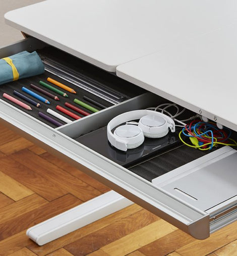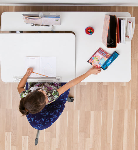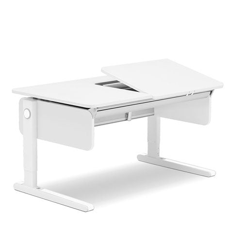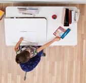 Los materiales como la melamina usada para los tableros son de máxima calidad , con las esquinas redondeadas para evitar golpes .Viene incluida con un atril extraplano de aluminio con sistema anti cerrado de libros , también con gancho para colgar bolsa o mochila.