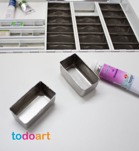 Inside we have 24 stainless steel compartments on the right that can be extracted if we want to put our watercolor in a tube or other materials inside them.