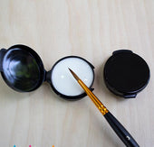 Drop water on the solid shampoo and rub the bristles of the brush, we will observe that as the paint softens the colors and pigments from the brush are released, we can repeat the process, once the brush is completely clean, rinse with clean water and leave dry off.