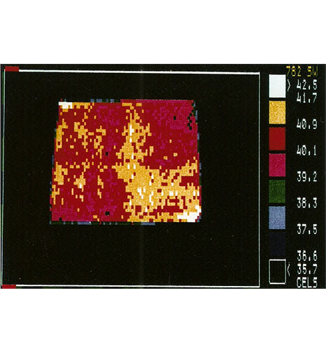 Figure 2: The thermographic image of the controller is shown, (measurements were taken on the top of the uncovered table) The color temperature varies on the work surface, which in this case is (1500mmx 1500mm) shows the maximum of 42.5ºC (white) and the minimum of 39.2 ºC (red)