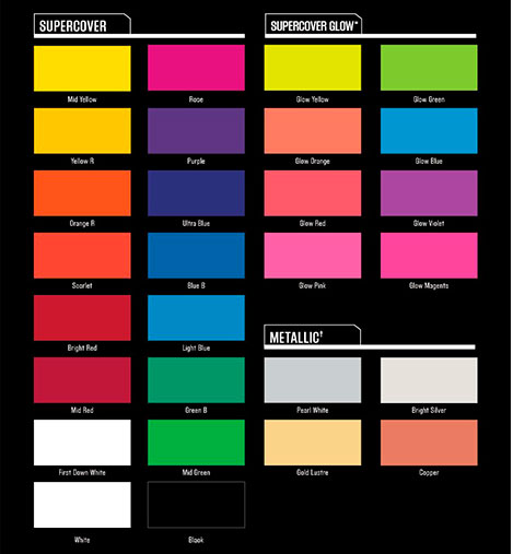 Supercover colors have been specially designed for dark fabrics to provide excellent coverage, opacity and definition while remaining as spreadable as possible.
